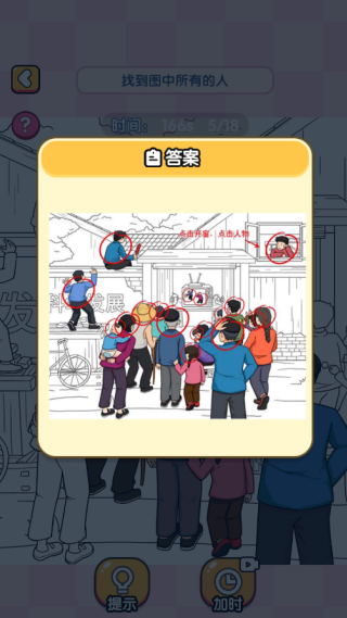 3、第二关要求在复杂的场景里找出所有隐藏的人物,点击对应的角色就能完成标记操作。