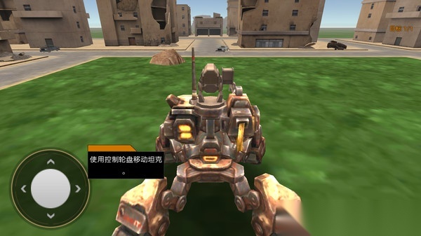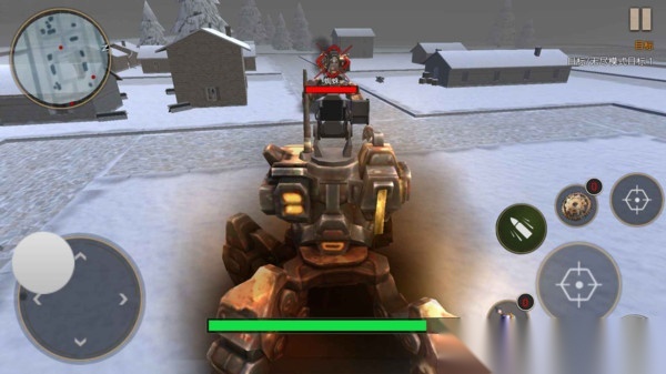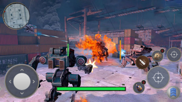 1、借助轮盘操控机甲移动,屏幕上配备了射击、技能释放等功能按钮,可用于发射火箭弹、切换武器模式。
