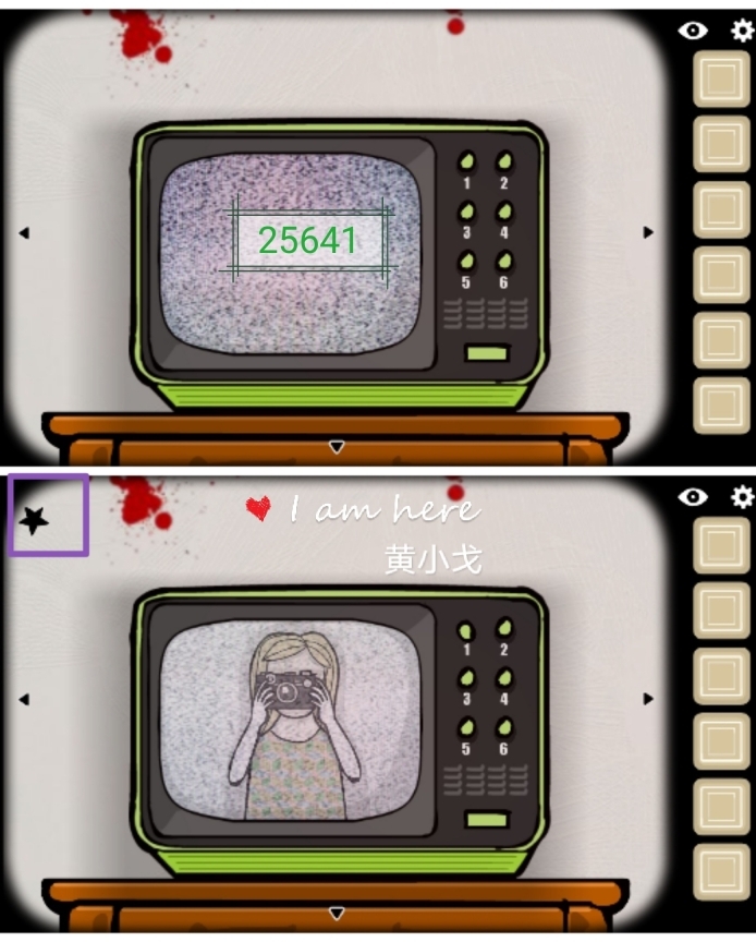 7. 年轻的Laura:(场景为秋天的带壁炉房间)操作方式是点击电视,然后依照在《逃离方块:锈湖》里绿色盒子上看到的数字序列25641来按频道按钮,之后会出现一个小女孩(这里要特别注意,必须先按这个数字顺序输入,要是先完成了电视机的其他任务再输入就无法生效了)