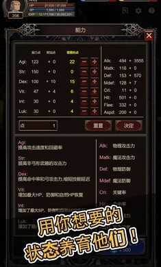 六大核心属性(力量Str、敏捷Agi、体质Vit、智力Int、灵巧Dex、幸运Luk)采用完全开放的分配模式,并且支持随时重置属性点。